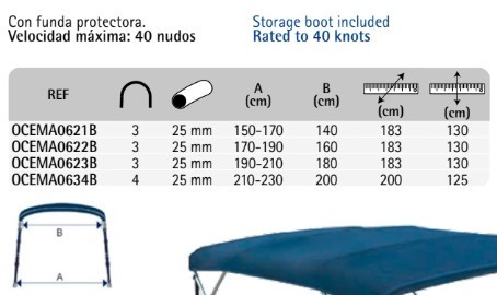 3 ARCHES POUR PETITS BATEAUX DE PÊCHE ET DE CROISIÈRE. CONSTRUIT AVEC UN TUBE EN ALUMINIUM ANODISÉ DE 25 MM DE DIAMÈTRE, AVEC DES BORNES EN PLASTIQUE. TENDEURS DE SANGLE EN POLYESTER ET CROCHETS EN ACIER INOXYDABLE. AVEC ÉTUI DE PROTECTION. TISSU POLYESTER IMPERMÉABILISÉ. COULEUR BLEU. VITESSE MAXIMALE : 40 NŒUDS