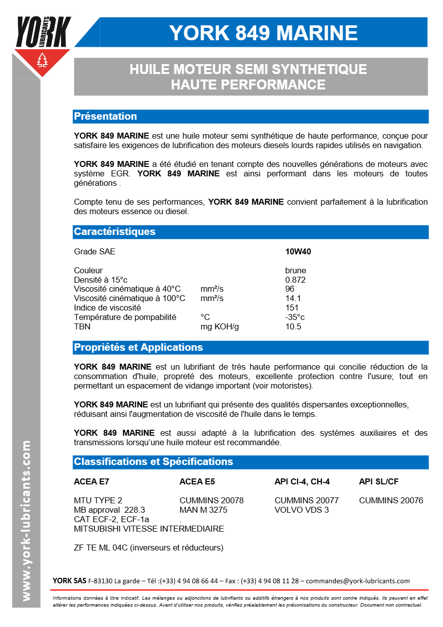 YORK 849 MARINE est une huile moteur semi-synthétique de haute performance, conçue pour satisfaire les exigences de lubrification des moteurs diesels lourds rapides utilisés en navigation. Celle-ci a été étudiée en tenant compte des nouvelles générations de moteurs avec système EGR. YORK 849 MARINE est ainsi performant dans les moteurs de toutes les générations.