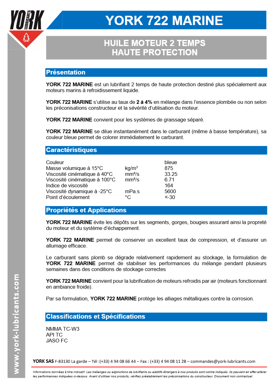 YORK 722 est un lubrifiant 2 temps de haute performance qui peut être utilisé en prémélange ou en autolub avec le Super Sans Plomb au taux de 2 à 4% selon la préconisation du constructeur et la sévérité d’utilisation du moteur. YORK 722 se dilue immédiatement dans l’essence, y compris à basse température : sa couleur bleue intense permet de colorer le carburant.