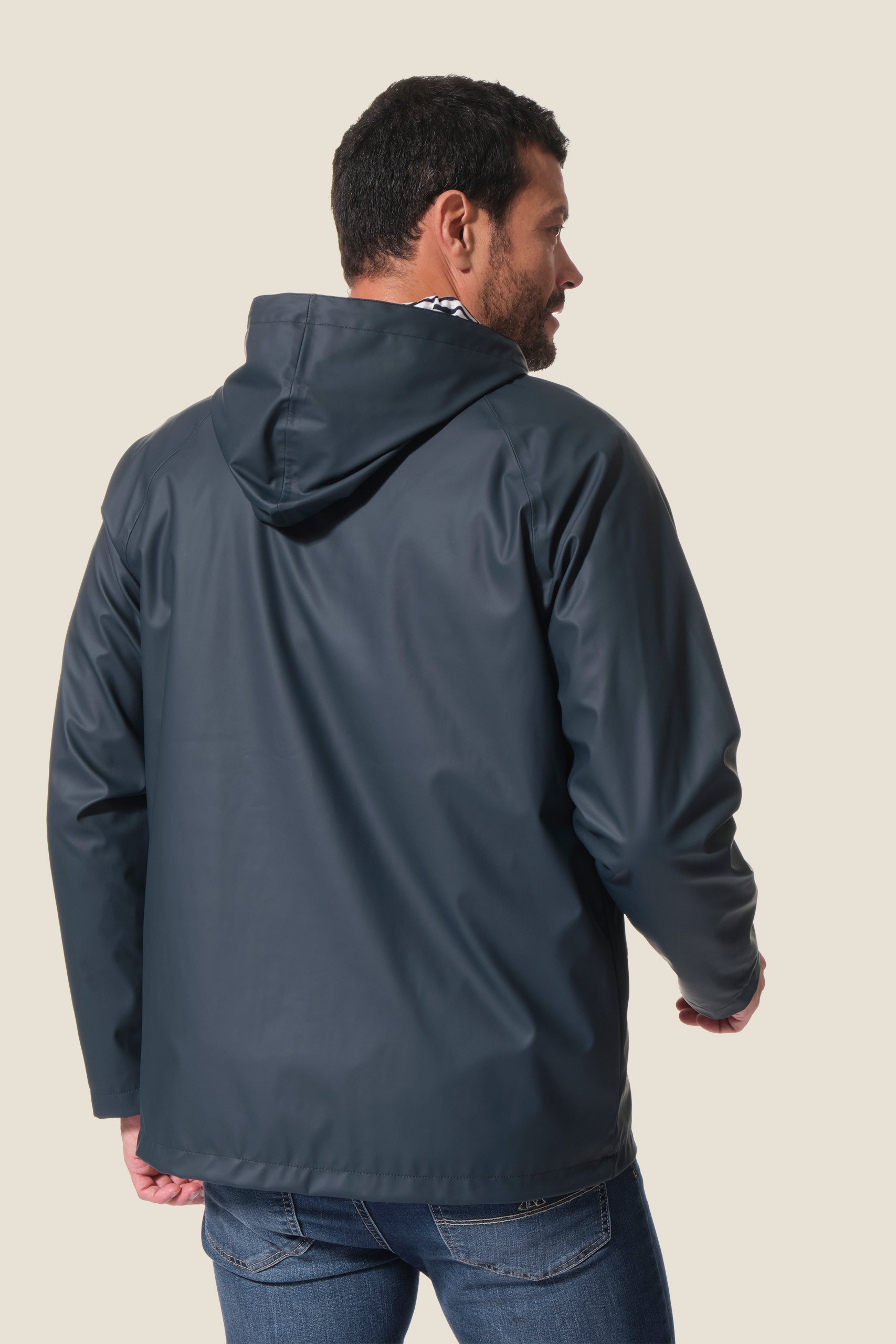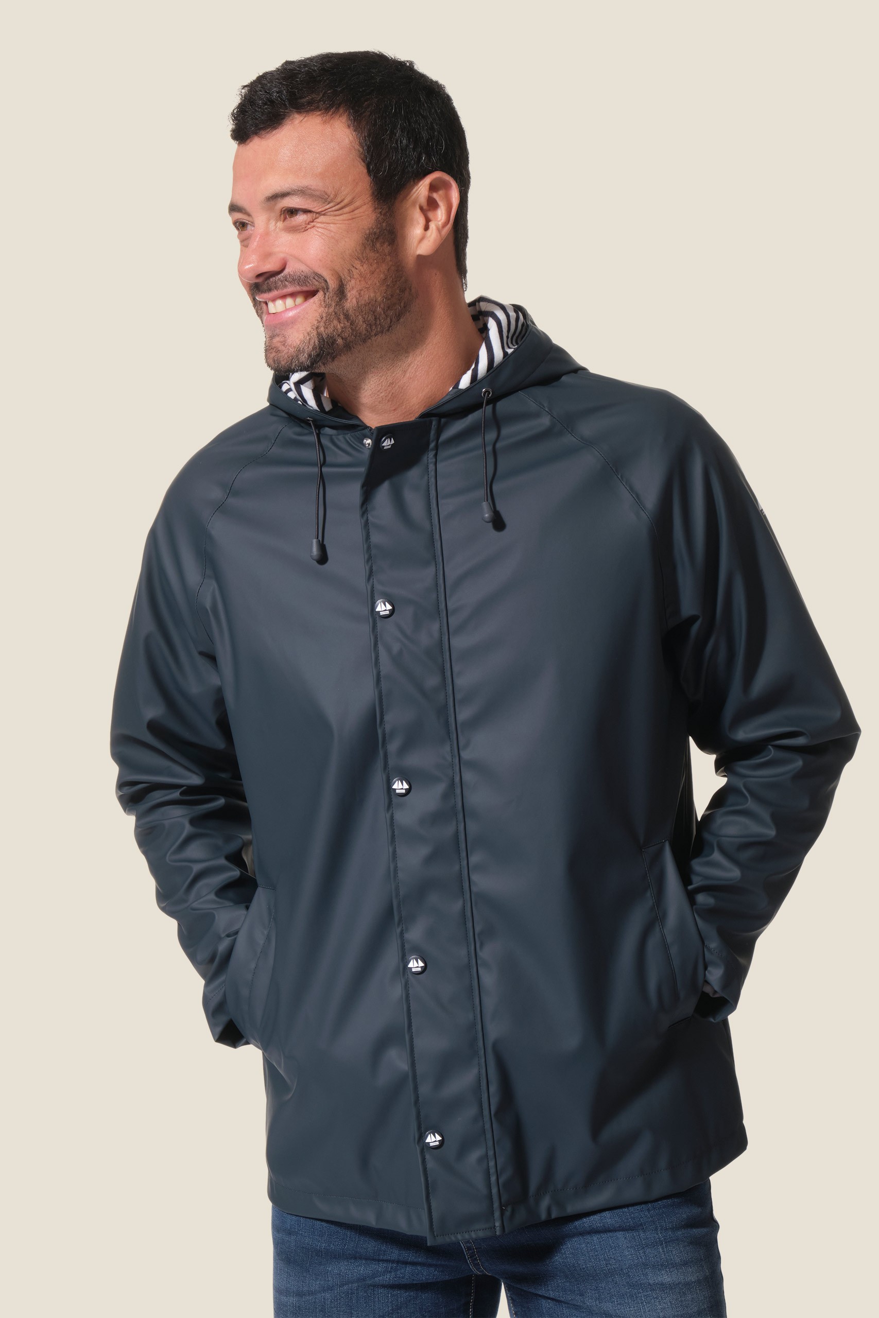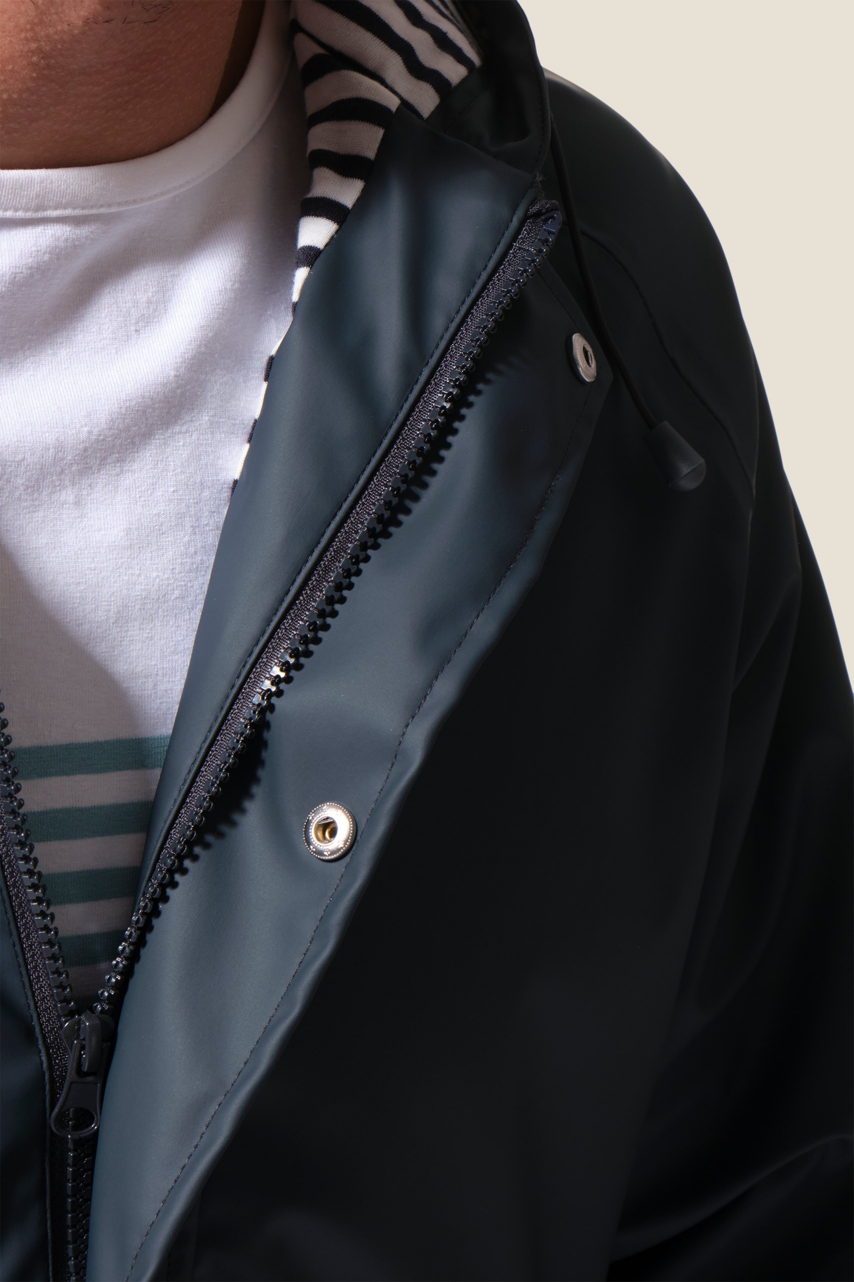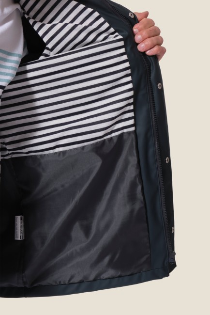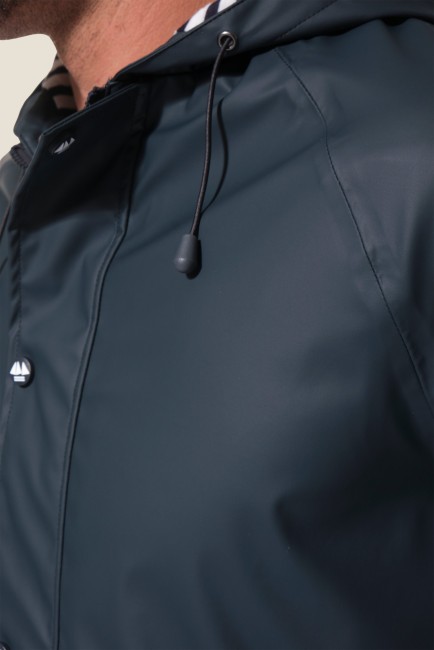 Restez au sec avec notre ciré authentique marin Proue. Sa doublure en jersey rayé apporte douceur et confort, tandis que sa coupe droite et sa capuche ajustable vous protègent efficacement sous la pluie.